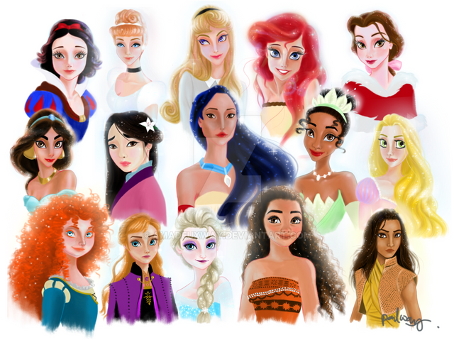 Glad you do! I tend to like to draw collections of characters in chronological order of their appearances. I suppose I could have also done them chronologically in their time periods, but some of them are iffy as to when they occurred. I could probably guess the century based on clothing and events, but it's still a pain... something like Aurora (1400s or 1500s), Snow White (1500s?), Pocahontas (lol 1607 or so because history!), Belle (mid to late 1700s, before the French Revolution), Rapunzel (~1800), Cinderella (1850s?), Elsa & Anna (1800s? Near the same as Rapunzel since Rapunzel shows up in their movie), Tiana (1920s), etc. Some of them are pretty hard to determine because Mulan had some historical elements that didn't take place in the same dynasties, and Ariel.......there were sailors for many centuries, especially during the exploration periods, and poofy sleeves were fashionable a lot. Anyway, everything gives me a headache so I'm glad I went with the order of their movies.