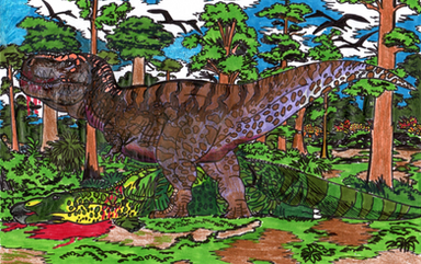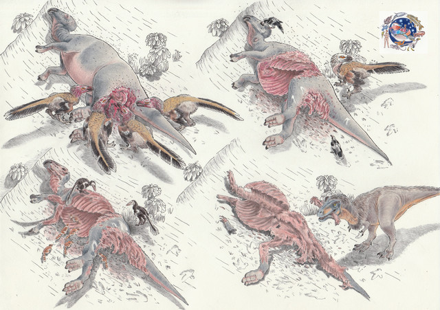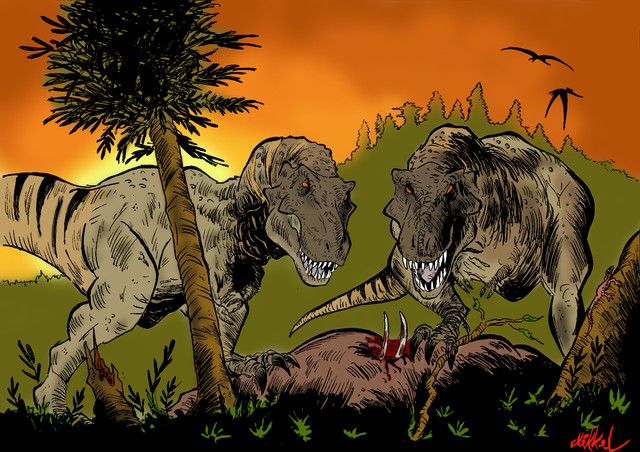 Ah, the fine line I walk drawing dinosaurs . I didn't model the raptors after any specific skeleton and kinda labeled them Deinonychus as an afterthought, didn't really call these Rhamphorynchoids (again, I just drew whatever generic pterosaurs came to me). Didn't ever say the raptors brought down the hadrosaur themselves. I did decide to model this T-Rex after Horner's scavenger theory for fun to see what he might look like.
