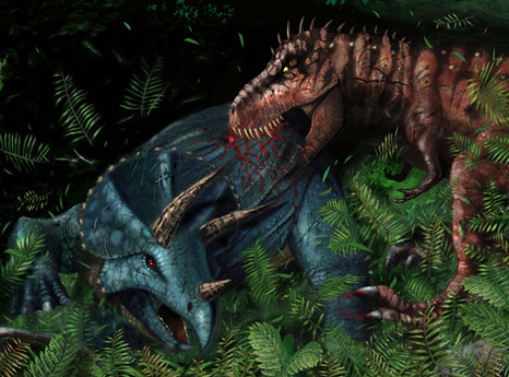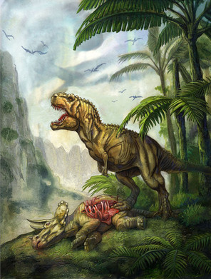 A T-Rex arrives to steal a Hadrosaur carcass from two Deinonychus. RAWR!Related content