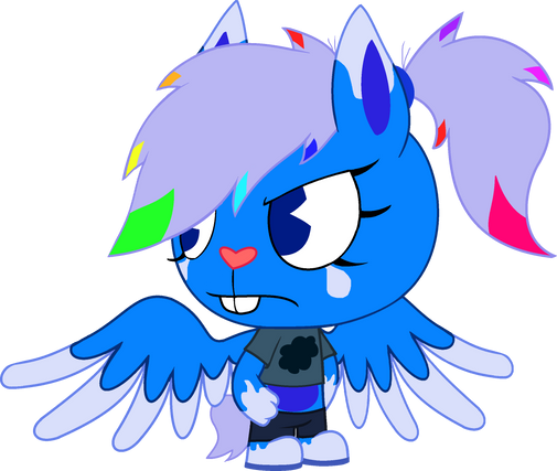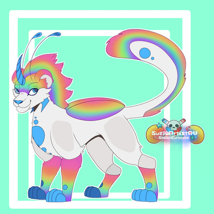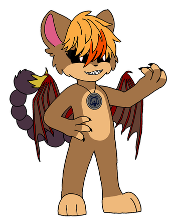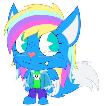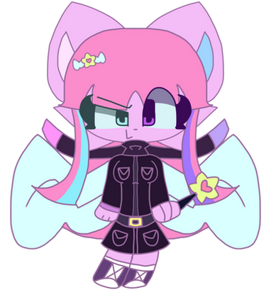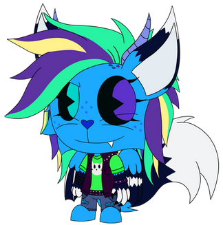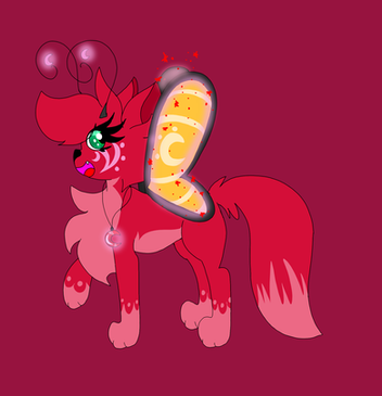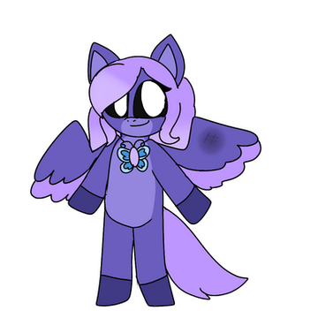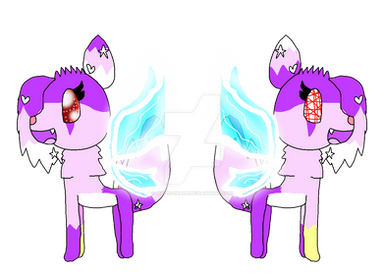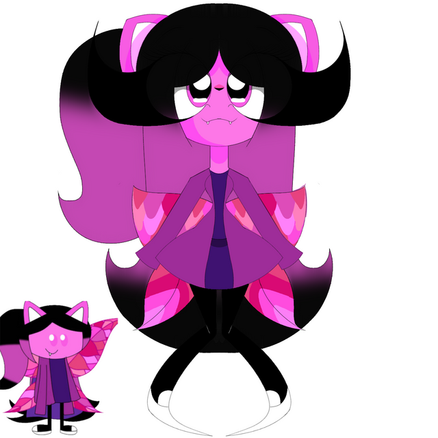 Nightfall is a violet genericaling with lighter violet inner ears, stomach, and bottom of the tail. She has yellow stars on her forehead, cheeks, and a star on the tip of the tail. She also has 5 yellow spines on her tail and yellow claws. Nightfall has indigo eyes and dark indigo scleras. She has pink antennas and pink, semi-transparent butterfly wings and She has fangs, claws, and a pink heart-shaped nose. She has dark light blue long hair and bangs with white sparkles on it.