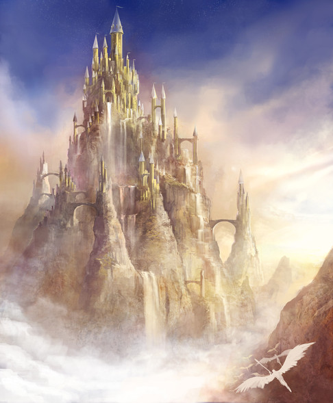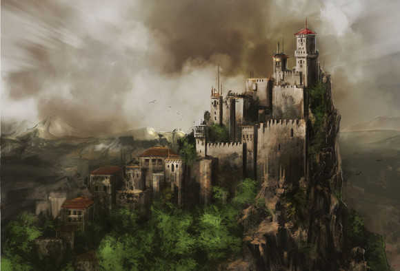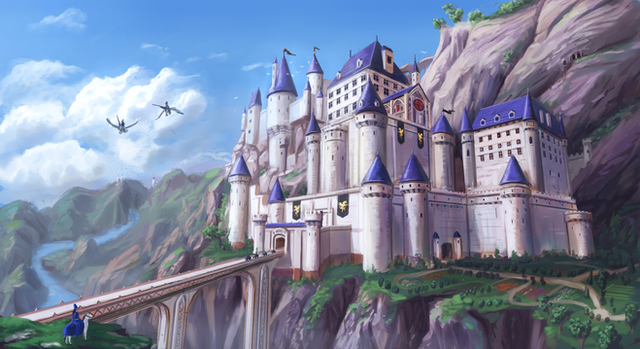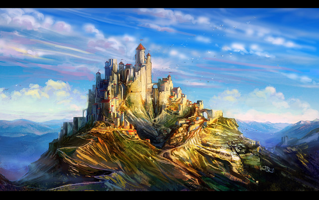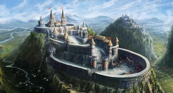 Love how the castle seems to be coming out of the mountain, and how the walkway leading up to the portcullis is carved from the rock. I also like the contrast between the rocky mountain and the smooth white walls of the castle.