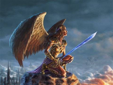 wow! epic, triumphant and majestic. fantastic piece! well done! love the mountains in the background and the glint of the sun on the blade.