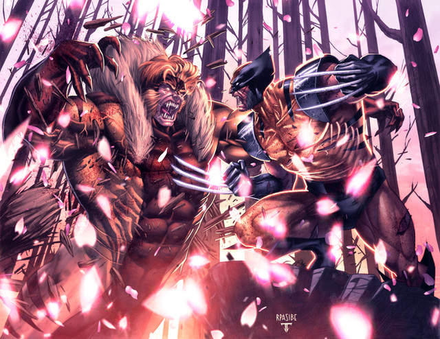 Very cool. I dig the size difference and Sabby's claws! Your wolvie looks amazingly perfect, except perhaps his leg seems slightly too thickly muscled to me.