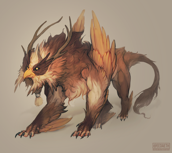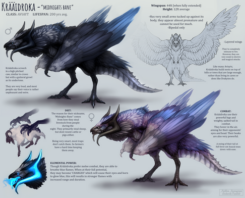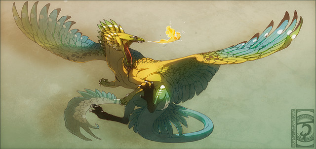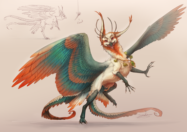 This is a Jade Rearwing Dragon. Their name comes from their intense bluish green colours and the fact that their wings sprout from their waist, rather than their backs. They have a wingspan of about 20 metres average. Rearwings also have wing like ears, the feathers of which spread all the way across the animal’s cheekbones. The ears can’t move, despite appearing just like a normal pair of small wings. They have 2 long horns on their head, 5 fingers and toes and a long, sleek tail. They’re generally very passive towards people, however they stay far from them, spending most of their time in the sky. They prefer mountainous or forested areas and hunt other dragons as well as elk and wild horses.