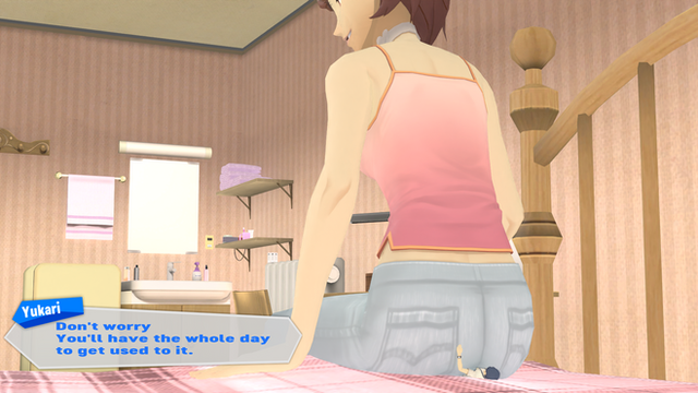 Junpei -(My body is all aching, but the fact of being seated by Yuka-tan is so rewarding. Heh, so it's pink, huh?)