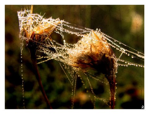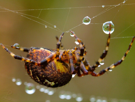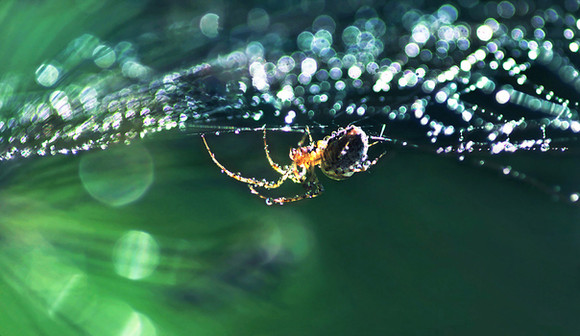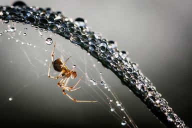 I like this! I love how the skinny legs and the orbs of water on the web make it look so delicate, but yet, as a spider, it also exhibits toughness. great job!