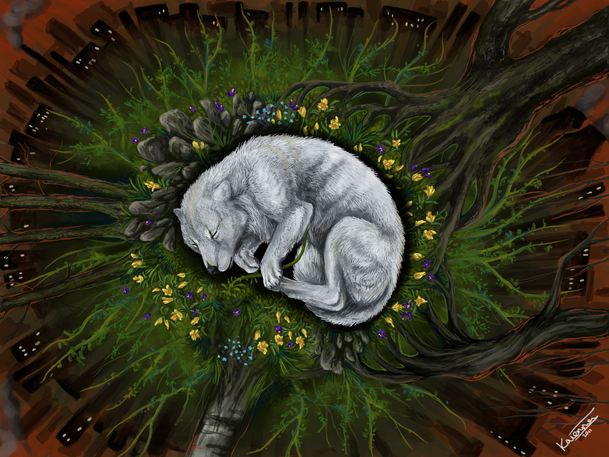 Awesome use of cold looking colours, aswell as great use of focus on the wolf being the subject as with all the vines closest to it, and the general darkness, being contrasted with the stark blue light really does show off that this is meant to give off a cold vibe, and the vines entangling the wolf pays real homage to the old saying "Stuck in Winters harsh embrace" Overall a really great peice