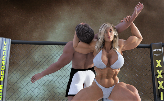 Once he's defeated, she lifts him over her head and walks along the ring carrying him over her head, stretched arms, showing everybody he was her trophy for a glorious victory.Β
