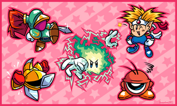Don't know how to title this, but anyway a drawing of Kirby characters that asked for help at the beginning of the game.Despite all jokes, only a third of these encounters lead to betrayal. Just so happens that the traitors come from very well known mainline games. I'm sure very few know of Mr. Star and/or Kirby's Super Star Stacker, a game that never left Japan (thought there is a fan translation).