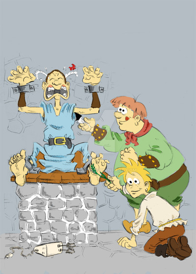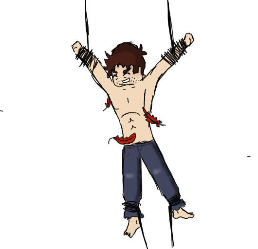 One of the first panels in the original BattleGate (now Flux Destiny) had a comment from a guard telling Hugo that he was going to hung up by his toes. I used a little creativity in my commission request years ago and Coz was nice enough to produce the lovely image. ^___^