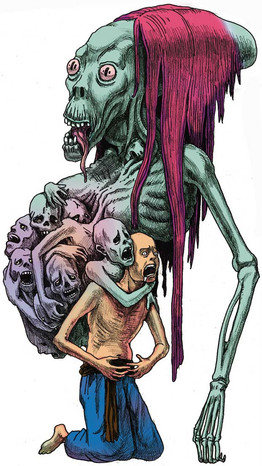 Interesting, at a glance, I thought he (of the severed head) was in tact, but fading to nothing like a ghost, or dust in the wind. It's the way the water-person's wrist and forearm follow the line that would be his chest. A very aptly appropriate illusion.