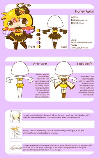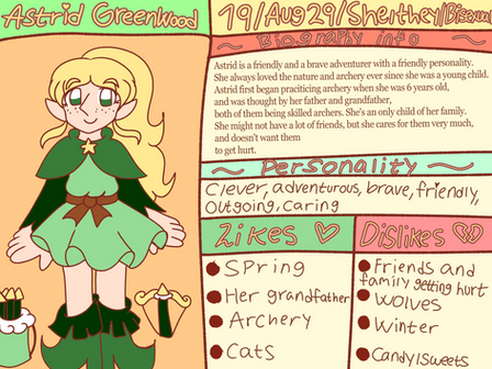 Like with a few of my other OCs, I wrote all of her basic information, biography (short description of her backstory), likes, dislikes and her abilities.
