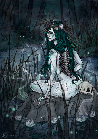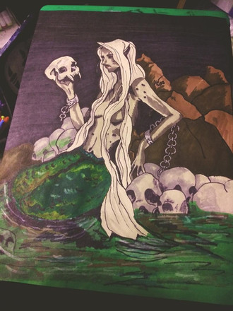You work is so beautiful! Lovely design and colors. I like the skeletons under water and her flowing hair.