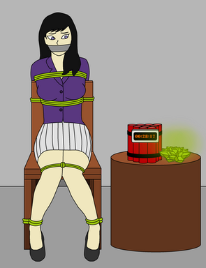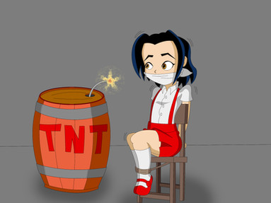 This was a beautifully drawn gift to me from . As you can see, dear Lady Amaretto has found herself in a peril dramatic enough for her grandiose persona. Bound hand and foot and left with a bomb ticking down, how can she escape?... By having damn loyal servants, that's how