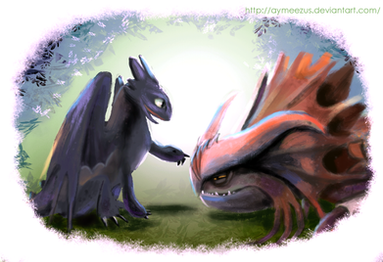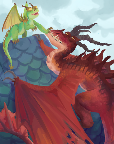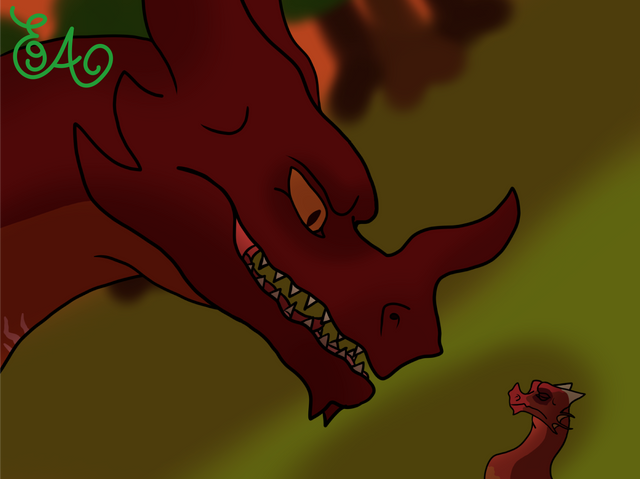 Well, that small dragon surely won't be hurt be someone else. XD Such a cool idea for a drawing, with Red being protective, is awesome and heartwarming, and his intimidating face, I love it, he really looks dangerous, and this frontal persective is perfect, it really looks like he's looking at the viewer. The pose is really good too, having his body lowered and his wings shielding the little guy.