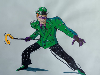 Biography: Edward Nigma is an individual who was born with a natural high intellect no other person has experienced before. During his time at the math class in high school, he really wanted to impress his teacher and classmates by showing how big of a genius he really is. Edward was somehow being mocked and rejected by them because they think he is not smart enough to solve problems including Algebra, Calculus, or even building Jigsaw Puzzles. After the end of the school day, Edward decided to quietly sneak back into the math class where he starts practicing a couple of puzzles and copying people's answers in order to solve his own problems. The next day, the teacher and the rest of the class were shocked of how Edward solved everything last night due to the fact that he was cheating and has never got caught by anyone at all. A few years later, he has invented a variety of technical advanced gimmick based weapons including blades in forms of jigsaw puzzle pieces, computer generated devices that create holographic images of riddles or mind games that would challenge or confuse any person, and his signature question mark shaped staff that acts as a grappling hook and a scythe that would kill any victim who gets in his way. Edward also wore a costume that he designed featuring a green body jumpsuit with black question marks all over it, a pair purple gloves, a purple belt with a buckle, and a purple domino mask that would make him look mysteriously menacing. He would later become known as The Riddler, a costumed criminal mastermind who challenges people by hacking into computer systems that show with some of the hardest riddles he can come up with, tricking his victims into dangerous death traps in forms of art, and killing people by using gimmick based weapons along with his strategies so that he could the most intelligent man in Gotham City by outsmarting everyone around him. The Riddler also encountered Batman and that he wanted to keep bringing up riddles or mind games against his opponent so he could expose the truth behind The Dark Knight's secret identity and eventually try to be superior than him at all costs.Voice Actor: Wally Wingert