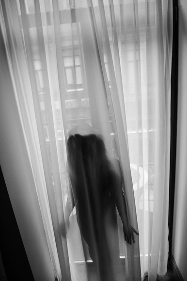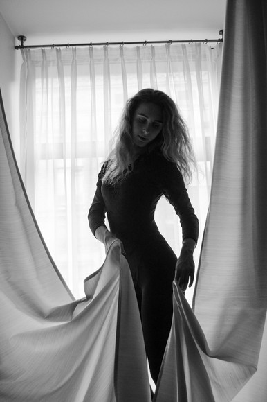 A big wow. Nicely composed--I admire how you positioned yourself (or your subject), the linear alignment of the hosed legs and drapery, the stark b&w contrasts. Really well done!