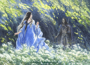 Wow!! This is absolutely gorgeous!! I love how you've painted Eol's features: very dark, expressive and virile- perfect for his character. And Aredhel is beautiful- those flowing white robes are so realistic and a lovely contrast to the darker side of the painting.