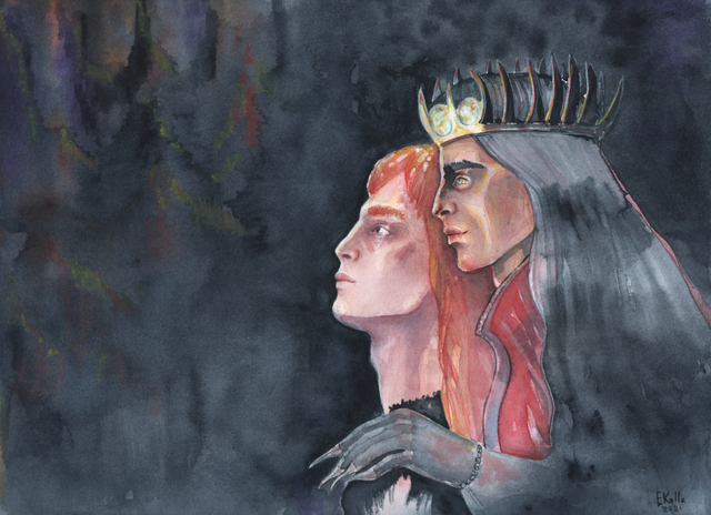 Спасибо большое! ^____^ с Финродом вообще очень сложно вышло, на нём ни одной опорной точки за что зацепиться, а добавлять фона по вертикали- будет много "воды", потёки крови и пряди волос тут использовала вместо этих самых опорных моментов х)) Основной тут конечно Саурон, но один его портрет без Финрода- было бы неполно) В общем спонтанно нарисовав Саурона потом очень долго возилась с тем, как решить правую часть листа))