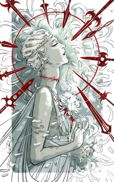 to juz ostatni z tej serii rysunek i ostatnia porcja przemyslen.Smierc jest odbierana jako cos strasznego i zlo, ale czasem przerywa cierpienie i przynosi spokoj oraz ukojenie. Kiedy sie czuje bol i pragnie sie tylko odpoczynku, moze byc wybawieniem. Kiedy umieraja dzieci lub mlode, silne osoby czesto sie odnosi wrazenie ze to nie w porzadku, ze cos jest nie tak ze swiatem lub ludzmi. Obraz malego cialka w kolorowym ubranku wrzucanego do masowego grobu szokuje, bo ta zabita istota stracila nie tylko zycia, ale i wszystkie szanse, ktore dostala przybywajac na ten swiat. Dla mnie kazde przedwczesnie zakonczone zycie to strata. Odbiera sie komus mozliwosc zrobienia czego dobrego, choc oczywiscie z drugiej strony ludzie sa zdolni do strasznych czynow. Smierc moze byc przypomnieniem, ze mozemy i powinnismy dawac z siebie to co w nas najlepsze, a nie najgorsze. Ze poki zyjemy powinnysmy starac sie naprawic zlo i zrobic cos dla swiata oraz innych. Oczywiscie jak zawsze wybor nalezy od kazdego czlowieka, ktory znajduje w pewnych sytuacjach.