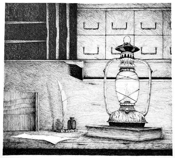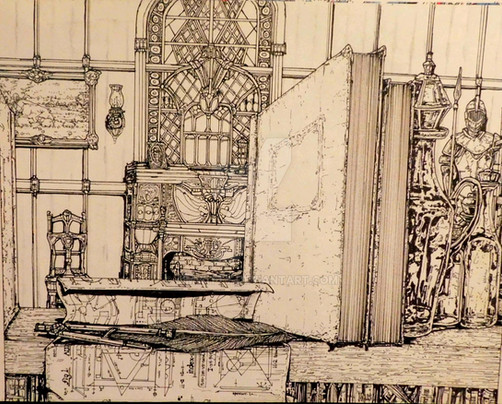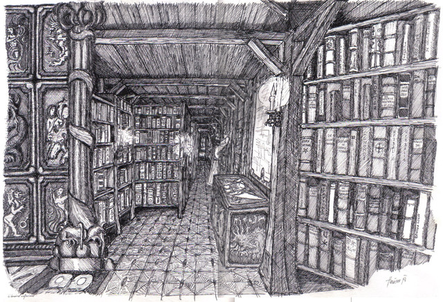I made this over the course of several days, stylized to be from a steampunk world, this library is one of my first perspective works.One of the books is by Tolkien