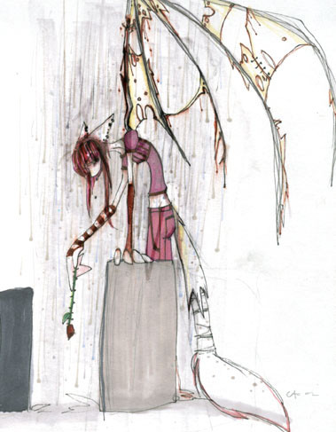 thats fucking cool and a GREAT combination of real media stuff. i love the shading and the shadows and the bg really really gorgeous. i've always wanted to do something like that with water colors. ecttt.
