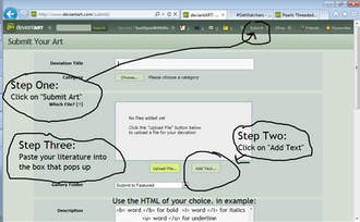 As some people have found out, there is a little-known secret that lets you easily unparse the rich text formatting that dA does whenever you "Add Media" and use those buttons to style your text in the description of your submissions.That's nice, but sometimes you'll be writing and formatting, and things just get messed up and it's hard to get it to format the way you want. It'll keep things bold even when you don't want it bold, or maybe you'll have edited something with a strikethrough and you want to undo it without having to delete it all and then type it again. Or maybe you're just more comfortable managing all your HTML manually, like me