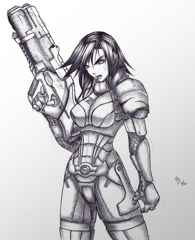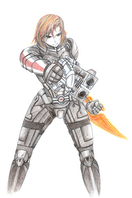 That is awesome! I love the detail and style. And, unlike so many femshep drawings, Shepard looks like a soldier, not some pinup model in skintight armor. Good work!