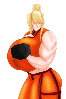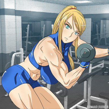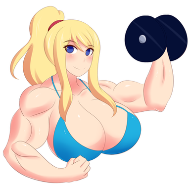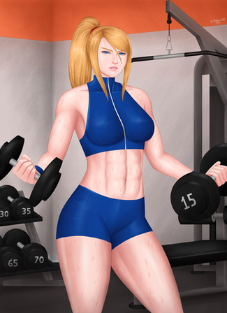 Kind of amusing how her workout clothes here resemble that of the one from Metroid Fusion. I guess in hindsight, it really does work for that purpose. In any case, this picture looks great, and her muscles are well-drawn and sexy. Kudos, and keep up the good work to the both of you.