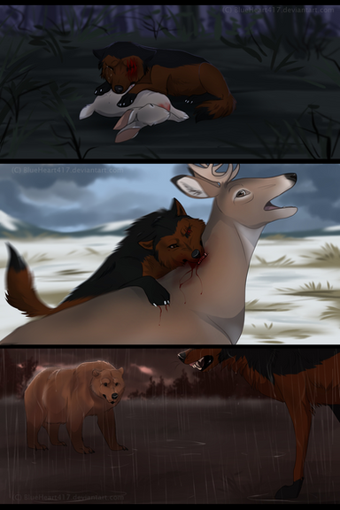 We met him while scavenging off one of his kills. We were starving… not that we had ever been good hunters, but this winter was particularly hard. We couldn’t find anything to eat, we couldn’t catch anything… his kill was all we had eaten that week… so we followed him. He wasn’t happy at first, and tried to chase us off a couple of times, but we couldn’t give in, and in the end I think he just accepted it. It was so cold no one wanted to argue, and I’m sure at least, he was grateful for the extra body warmth. So that’s how it was, I’m not sure how long for, he walked on and we followed. I didn’t know his name then; he rarely spoke to us so we didn’t speak either. It was cold, and silent, and lonely, but we were alive and he was our lifeline.He was a stranger there like we were, he must have been because he had no territory or place to sleep. Aik thought he was looking for someone, but whatever it was, and wherever he was going… we followed. On that particular day we were walking across a mountain plain, a blizzard had sprung up from nowhere, yet he refused to stop. It was hard to see anything; everything was completely white except for the vaguest of shapes. We were struggling to keep up with him then, but we couldn’t stop and were frightened we’d lose him completely. So we kept shouting at each other to keep going, to not give up and to move faster. We were so concerned with that that we didn’t see the crevasse in front of use. The snow had almost completely covered it over but Aik must have stepped on it because the snow gave way and she disappeared instantly. It all happened so quickly I didn’t know what had happened. I ran to the hole, screaming her name, almost falling in, in the process. It was so dark in there that, for an instant, I couldn’t see her at all. Then I did, somehow she must have grabbed one of the roots hanging down as she fell, because she was dangling there. She looked up at me, her eyes filled with fear, and I realised she ok. Luckily, the root she had grabbed hung down from the tree near me and I could just about reach it. Gripping it gently in my teeth, I pulled with all my strength, trying to pull her up.. but I couldn’t. I tried again and again, but I just wasn’t strong enough, there was nothing I could do. Finally I let go, exhausted, I didn’t look down, I couldn’t. I could still see her eyes pleading with me though. I knew she must be having the same thought I was. That sooner or later Aik would lose her grip and fall… and there was nothing I could do to save her. I looked away; I couldn’t see her face again, knowing that it would be the last time. The snow was beginning to clear a bit now, I could see more shapes then I could before, one of them was moving. I wasn’t the only one here! of course I wasn’t! …and he would surely be strong enough. I looked down at Aik again, as realisation dawned.