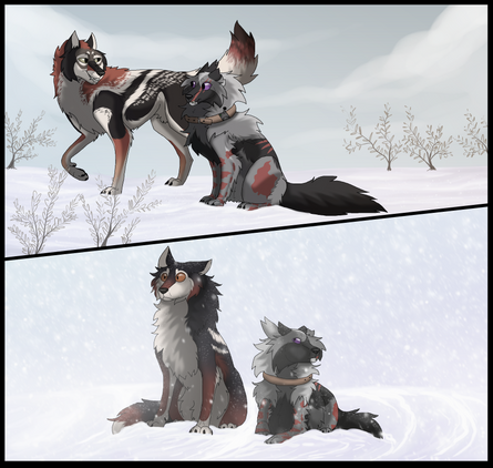 I think the perspective of the second image was a pain in the butt? It looks great but hard. How Aik's dangling there is very dynamic and Coro being all like "!!!" adds much to the scene & the way how Coro's fore legs grabbing the snow.. <3