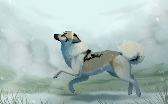 This really is a beautiful picture of a beautiful doggy. I totally like the dynamic pose and features in this piece here. The background and the snow effects are done pretty well too. Once again you did a brilliant job on the furdetail, the whole style and composition as well...