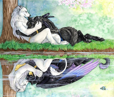 I'm very happy to finally reveal this! After so many delays, computer dyings and a hand injury I was beginning to wonder if I would ever finish it, but I'm very happy with the results. Thanks for being an ever patient commissioner TamaskaKitsu!This image represents his two characters, Kitsu and Kross, both the same yet different, reflecting each other and the people who helped bring them to life. (ItsProbablyMars behind Kross and Xeshaire and myself behind Kitsu) I'm very honoured to be included with these people!