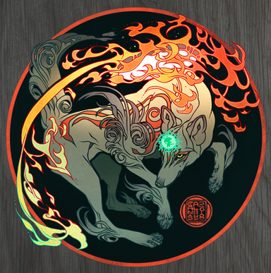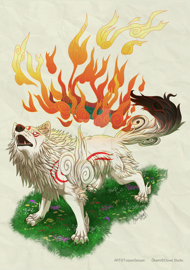 #amaterasu #ammy #anger #animal #bite #canine #capcom #cool #design #digital #fan #feral #fight #flames #fluffy #furball #game #gamer #green #grey #growl #head #lupine #okami #realistic #red #shot #snarl #swirls #teeth #white #wolf #elementalspirits #issun #art #ōkamiden #heleashernerd