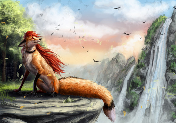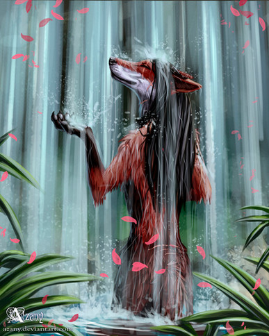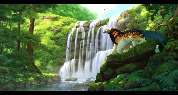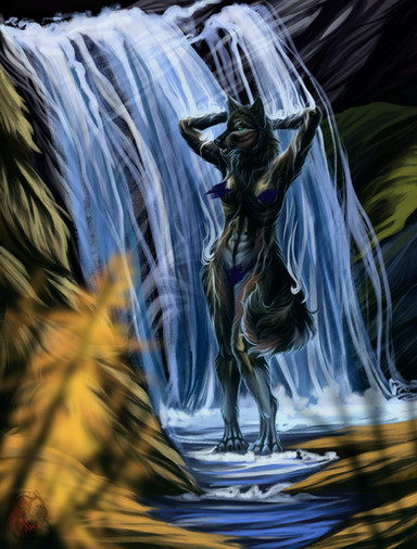 #fox #waterfall #canine #animal #anthro #blue #brown #colourful #digital #fantasy #green #happy #kitsu #photoshop #quiet #red #reflections #relaxed #rocks #secluded #sunlight #taur #trees #wading #washing #water #wolf #elementalspirits #heleasher #leucisticlynx
