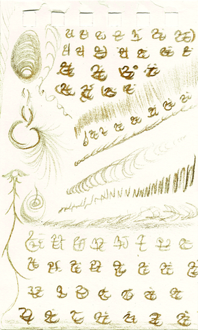 The Daine of Withwandiê use a pretty flower & leaf script. It is written from top to bottom of each line.Along with the consonant glyphs, seven vowels are indicated by the use of colours: o, a (purple); u (green); i, I (brown); e, ɛ (grey). The first of each pair is considered "heavy" and its tint is darker; while the second is "light" and its tint is brighter.