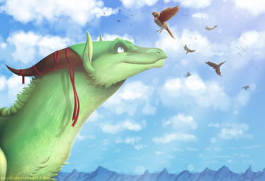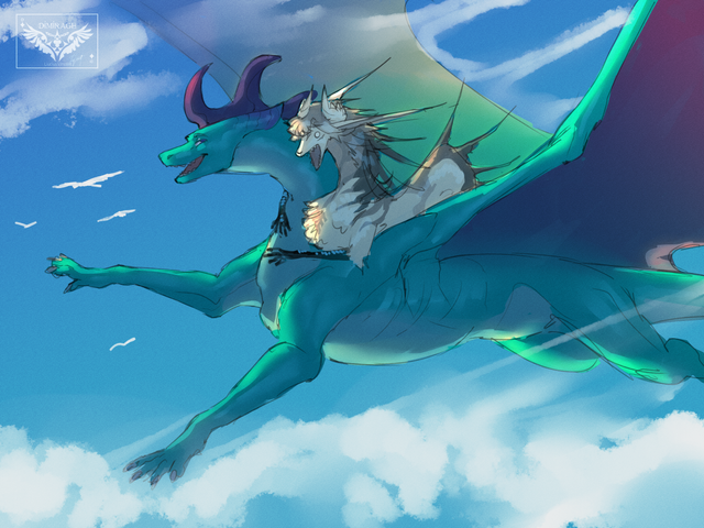 This looks wonderful! my only question is, why you drew the wolf (WingPM's character, I guess) so unstable while riding a dragon? xD He would have to be more on top of the dragon so he won't look like he will fall down at the first turn