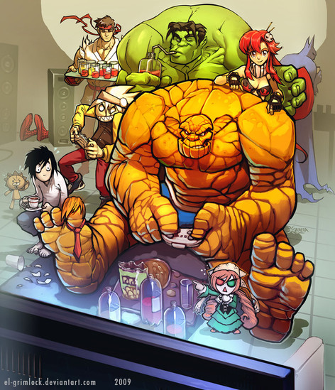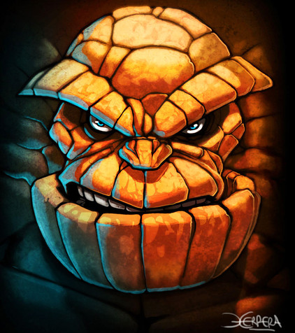 He looks completely excellent in your style, and the colouring gives a great sense of depth to the piece; it's like his stone arm is coming right out of the screen. Ace!