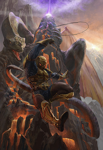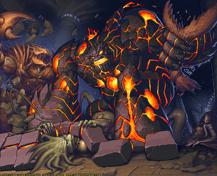The Thing riding a massive stone dragon across a field of magma. It's hard to imagine a cooler image!
