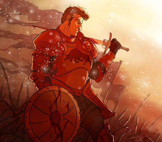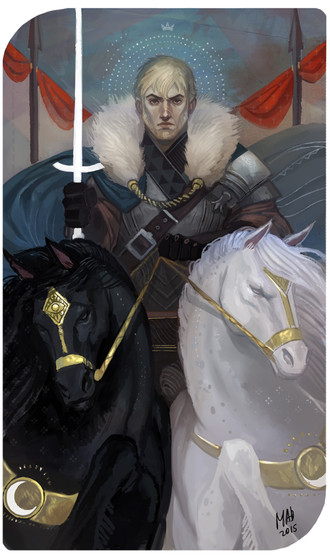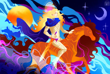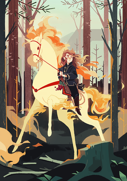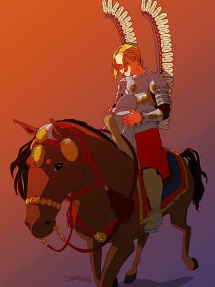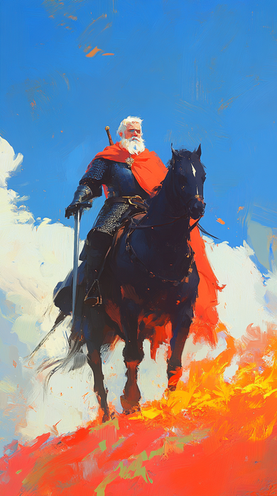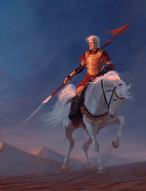 Wow, this is stunning! I love the color choices, they're very unique and give the piece a very distinct visual identity that is quite eye-catching and appealing. I also adore the style the man and his steed are done in; it's an interesting mix of fluidity and details with almost minimalist outlines that makes them both memorable. I think this is just a wonderful piece all around and that you did a great job making it. Keep up the good work friend!