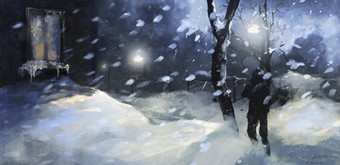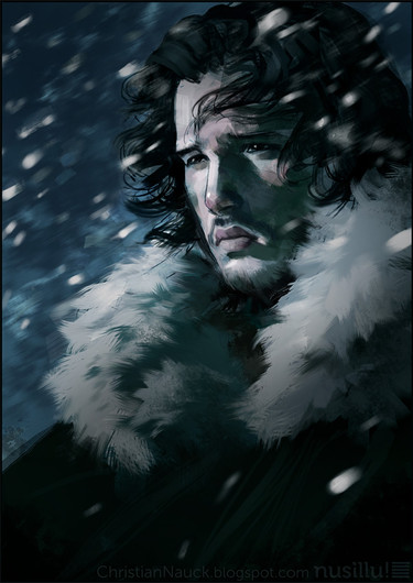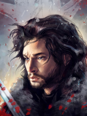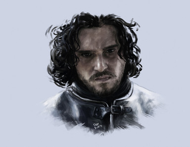 I love the ethereal nature of this piece. It almost feels like the scene is being watched through the eyes of something else, like his direwolf Ghost or a heart tree. His face gives the impression of deep sorrow, in some way connected to hearing about or witnessing the deaths of those close to him.
