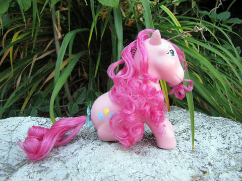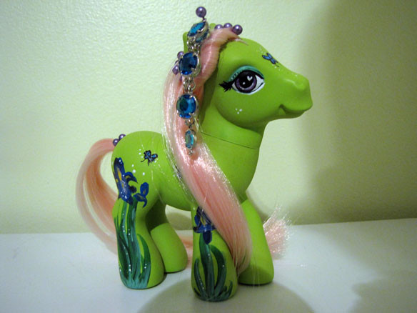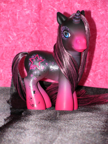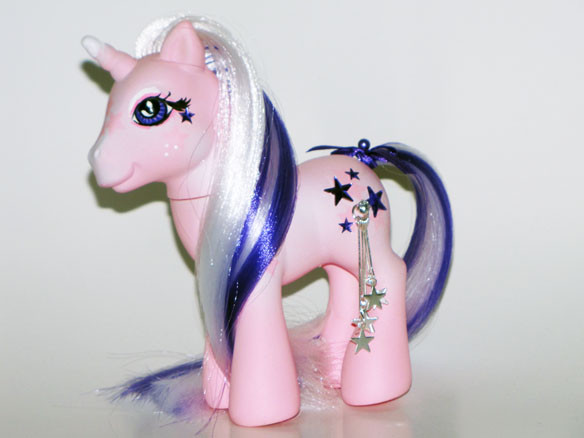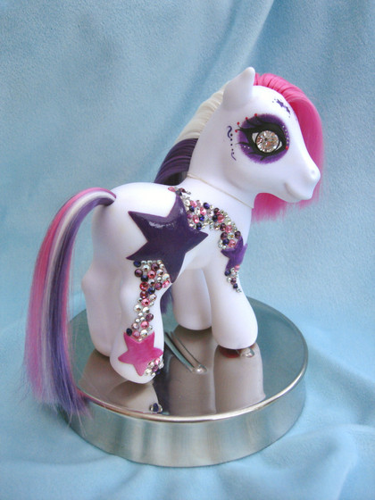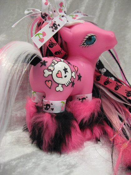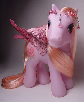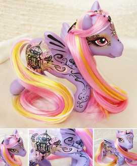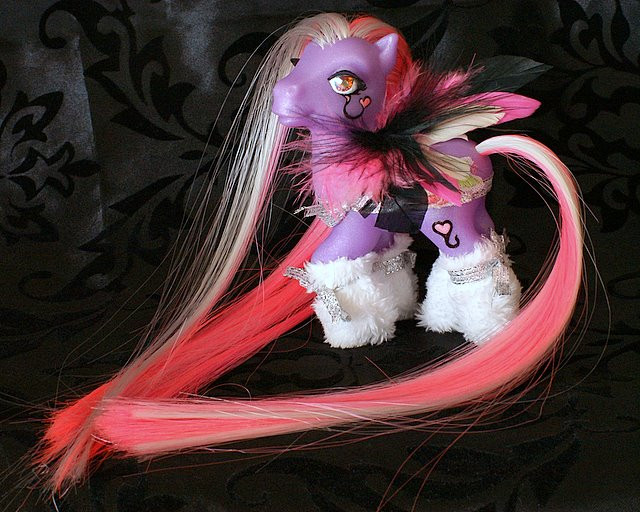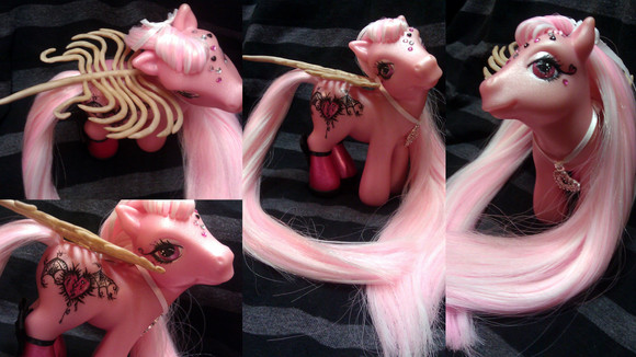While looking at some jewelry at a clothes store I found three pieces that I was dying to use on a pony. I also tried out a new idea with her as well. I used the original color of the pony and masked zebra stripes all over her. I then airbrushed a white gradient along her body, back of her neck and forehead. After removing the masking tape she had these subtle ghost stripes. I then gave her new eyes, and details around em, a few more added spots here and there and the butterflies. Before I added the hair (Dh Back magic with thin striped of Heart Throb) ribbons and feathers, she looked so sweet x.x So after doing a few thin braids and pulling it all up and tying it off with ribbons and some feathers she looked sassy.Related content