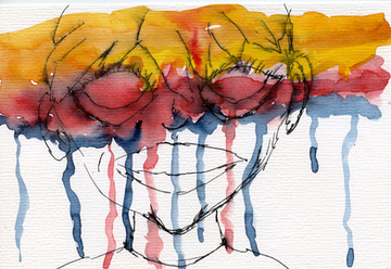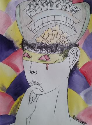 Another piece in my new series "Lost in Translation." Most of the other pieces the women have hair so I was going with a bald look in this one XD. The shapes of heads are actually kind of hard to pull off, I now realize how I just cover them up with hair... who knows what deformities lie under it O_o Do you think the explosions of color are her hair? Or the background? Or maybe ideas... I don't know.This series was inspired by my time spent studying abroad, displaying my anxiety and culture shock from not understanding the visiting country's language. This is why they are missing mouths- a barrier and inability to communicate. The series was installed in a very dark and tiny, narrow space in the gallery to create the feeling of claustrophobia, another feeling I had to combat with. Finally, they were set really high upon the walls so they were "looking down on you", making the viewer feel small and insignificant amidst a sea of disapproving figures.