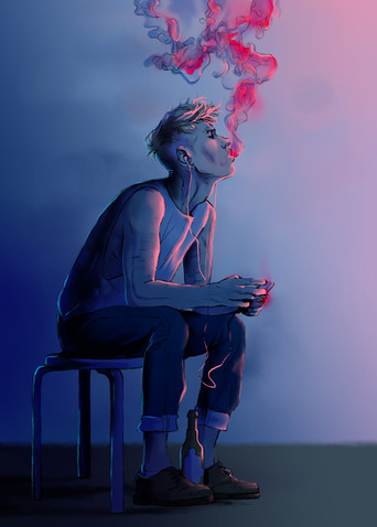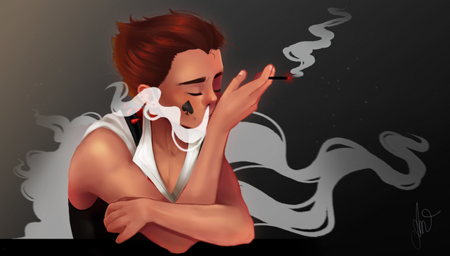 I love the lighting and his beatiful slender hands and gorgeously rendered hair. I really like the whole of the work and I keep looking at it. Its really gorgeous! Even the smoke, everything looks like you took such care with it. I love this.