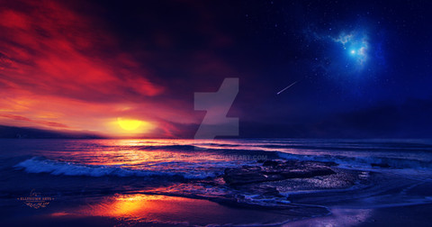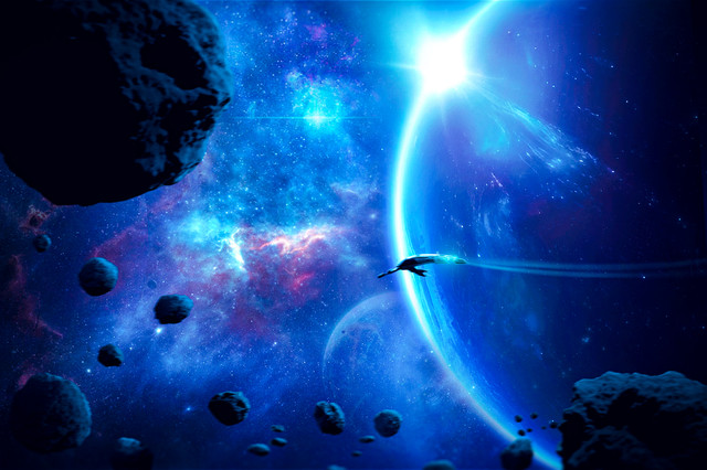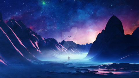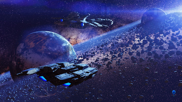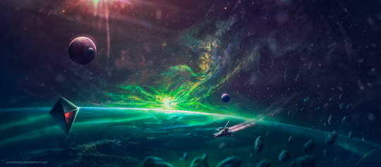 Fabulous work Gene !!! You are just amazing !!! Top art again !! Intense, powerful, impactful at first glance !! The work on the light is well mastered and the scene and composition, just outstanding, while the colors are a pure cold delight !!! The depth in this wallpaper is incredible by the way you run your composition !! You build it with a succession of elements that interlock perfectly, like in a puzzle !!!! This burgundy make pop the blue sinusoidal line, like carrying it, giving more power to your structure, with this solid first plan. You play with our eyes, catching them there, and lifting them in an awesome trajectory that make us meet the light intensity, whose ray sit gently one planet, with an equilibrium game and an enchanting aerial metaphore that I discover, giving motion to it like a marble going down a tilted thread, like a tightrope walker, awesome !! This cinematic scene is just powerful with this “wall“ of heavy meteors that move fast, enhancing the spaceships at race with an wesome foggy essence on the left that brings a special atmosphere. What's more the play with the bows of the two big planets seen in overlap, and their bright outlines, brings movement too. The stars achieve this tremendous stylish space wallpaper. Awesome Gene !! ^^