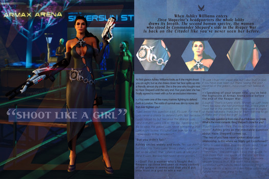 What you hold in your hands right now is not just another magazine. This, dear friend, is the ONLY in-depth interview with the famous Commander Shepard you'll ever find.In honour of The Emily Wong Foundation helping youngsters get into journalism Rue Shepard is flashing abs, biceps and a lot of sexy smiles, in hopes to raise money for the