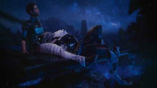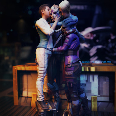 I have to agree with Ren that the ladies could be brightened up a bit due to the dark colors of the background. Their posing is perfect and I like the little star burst effects you put on the Omni tool and chess piece. And it looks like the orange glow from the Omni tool and chess piece reflect just right off of Liara and Sammy.