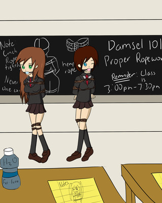 Here at Captive Academy, we offer a wide range of different subjects. Due to the mandatory restraints of all our students, our students must find different ways to show their work for our teachers. Here, the student has shown clever use of her teeth to hold the chalk. However, we hold all our students at a high standard, if she does not finish the problem within the allotted five minutes, then she will have to spend the following night bound and gagged in detentionIntroducing a new series called, Captive Academy. I know for basically everyone the school year is kinda coming to a close, but after drawing this, I really want to expand on it. Also, this new series makes up for the lack of activity I've been having recently. I already have tons of ideas for history, literature, biology, and a ton of other subjects. Stay tuned!