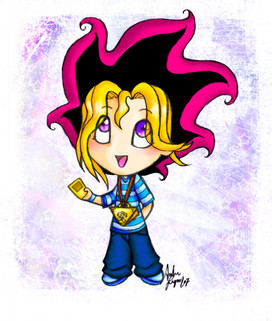 Rebecca looks cute with her hair like that, and chibi-Yugi looks a bit surprised.