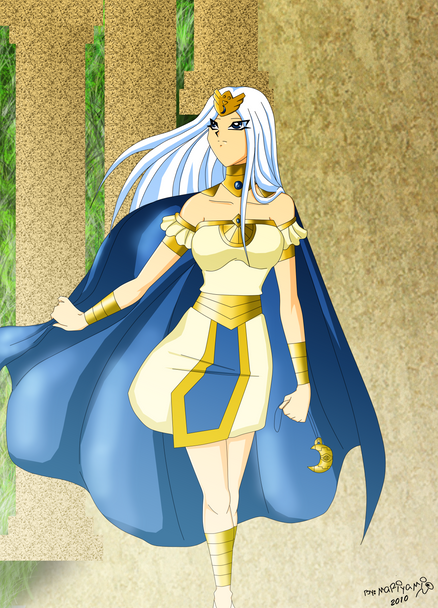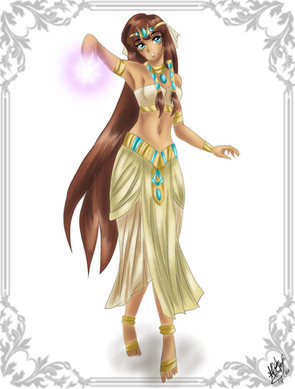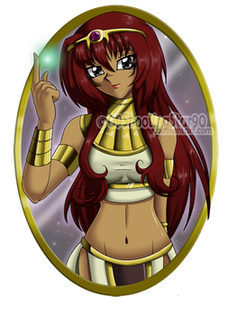 I liked her outfit a lot too, the golden details are very nice, and I like the purple on her bracelet, it breaks the one tone look of the whole thing! The shading is awesome and you did a wonderful job on the background again *-*